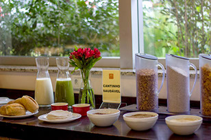 Para que seu dia comece bem, dispomos de um maravilhoso café da manhã, com um Cantinho Saudável cheio de opções naturais, integrais, sem glúten e sem lactose: